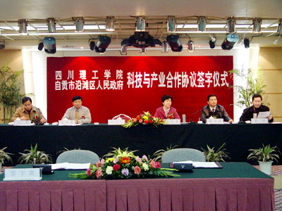 2005年1月18日上午,四川理工学院、沿滩区人民政府科技与产业合作框架协议在自贡汇东大酒店举行了签字仪式。自贡市人民政府副市长石岷嘉、四川理工学院院长曾黄麟、副院长谢峰、沿滩区人民政府区长杨玉康等区级领导和四川理工学院、沿滩区相关部门负责同志和部分专家学者参加了签字仪式,四川理工学院院长曾黄麟、沿滩区人民政府区长杨玉康代表协议双方签字。会上区长杨玉康就沿滩区目前的状况作简要介绍;副院长谢峰就目前四川理工学院的情况作了题为《优势互补互利互惠共创美好未来》的发言,副市长石岷嘉代表市政府对合作的成功表示祝贺并给予厚望。双方一致认为:院、区的合作能充分发挥四川理工学院的品牌、人才、技术、教育优势和沿滩区的区位、资源优势,双方通过多种方式、多种途径,实现多层次、多领域的互利合作。是贯彻落实中共中央、国务院《关于加强技术创新,发展高科技,实现产业化的决定》的重要举措,具有较强互补性,合作共赢潜力巨大,前景广阔。双方完全可以利用各自的特点和优势,遵循市场经济发展规律,进一步巩固业已存在的良好合作关系,构建更加紧密、更加有效的合作机制,加强相互联系,扩大交流领域,推进战略合作,实现共同发展和繁荣,在促进地方经济建设和推动自贡市区域经济发展战略中发挥更大作用。