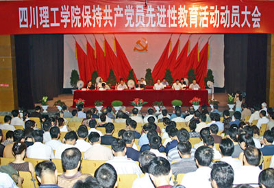7月15日上午8:30,我院保持共产党员先进性教育活动动员大会在营盘校区演播厅隆重举行。自贡市政协主席徐大蒙,市委常委、宣传部部长邱德峰,市委保持共产党员先进性教育活动督导组组长黄蜀熊参加会议,并与我院党委常委游建军、曾黄麟、唐健禾、李开世、邓起方、钱维新、龚敏、谢峰、杨荣建在主席台就坐。大会由学院党委副书记、院长、保持共产党员先进性教育活动领导小组副组长曾黄麟主持。