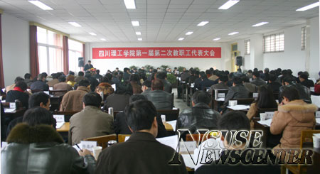 为了贯彻落实党的十六大精神,充分发挥教职工的主人翁作用,推动学院的改革和发展,我院于 2005年12月28日在汇东校区召开了第一届第二次教职工代表大会。会议审议通过了《四川理工学院教职工福利费管理办法》,对学院校务公开进行了满意度测评,满意度为88.15%。党委书记游建军、院长曾黄麟、党委副书记唐健禾、李开世、副院长邓起方、龚敏、谢峰等在主席台前就座。125名正式代表和24名列席代表参加了会议。会议由执行主席唐健禾主持。