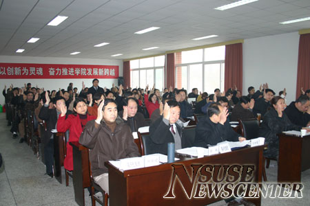 计财处处长朱其螯作了《学院财务工作》报告,国有资产处处长余玲作了《学院物资设备采购规定说明及项目执行情况》的报告,基建处处长张鹏作了《学院基建工程招投标规定及程序执行情况》的报告,纪委副书记、监审处处长贾金玲作了《强化校务公开监督 促进依法治校工作》的报告。