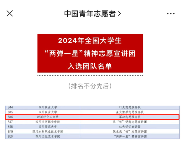 为深入学习宣传贯彻习近平新时代中国特色社会主义思想和党的二十大精神,落实“强国复兴有我”群众性主题宣传教育活动相关要求,引导动员青年学生大力弘扬井冈山精神、延安精神、“两弹一星”精神,团中央青年志愿者行动指导中心联合相关单位从全国遴选出全国大学生“两弹一星”精神志愿宣讲团、全国大学生井冈山精神志愿宣讲团、全国大学生延安精神志愿宣讲团各一千支优秀团队。
