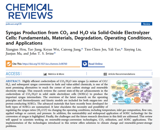 近日,我校马建军教授、姜彩荣教授清洁能源课题组硕士研究生侯香君作为第一作者在国际顶级期刊《Chemical Reviews》发表“Syngas Production from CO2 and H2O via Solid Oxide Electrolyzer Cells: Fundamentals, Materials, Degradation, Operating Conditions, and Applications”的封面评论文章。《Chemical Reviews》(2023年影响因子:62.09)是由美国化学会于1924年创刊并发行至今的国际化学领域内最具权威性的学术期刊之一,以综合性、权威性而著称。