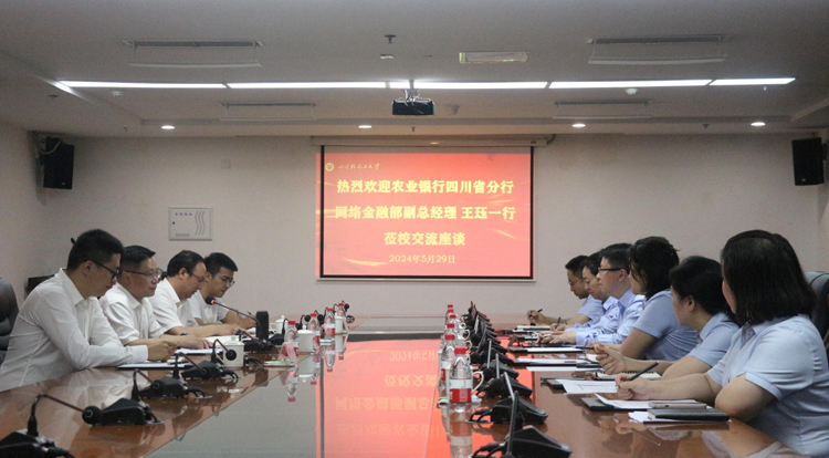 5月29日,中国农业银行四川省分行网络金融部副总经理王珏一行到我校宜宾校区洽谈合作,学校党委常委、副校长胡光忠参加会谈,后勤基建处处长、后勤服务公司总经理刘自山主持会议。