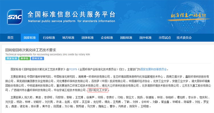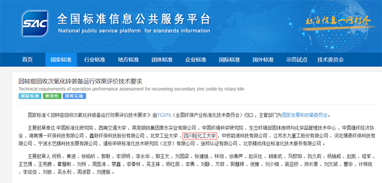 近日,以四川轻化工大学为主要起草单位之一,我校绿色化工与废物资源化协同创新团队负责人刘小楠研究员作为主要起草人,分别联合中国标准化研究院、中国环境科学研究院、生态环境部固体废物与化学品管理技术中心、清大国华环境集团股份有限公司、中核能源科技有限公司、西南交通大学、北京工业大学等20余家单位,历经3年时间,起草的国家标准《回转窑回收次氧化锌装备运行效果评价技术要求》(GB/T 44057-2024)和《回转窑回收次氧化锌工艺技术要求》(GB/T 44055-2024)在全国标准信息公共服务平台正式发布,归口及执行单位为全国环保产业标准化技术委员会(TC275),主管部门为国家发展和改革委员会。