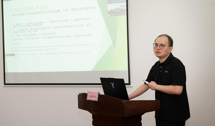 顾祥作了“教育量化研究的探讨”主题分享。他结合自身的研究成果,强调了选题在教育量化研究中的核心地位。他提出,成功的选题应遵循三大原则:一是从实际问题出发,通过数据分析寻找解决方案;二是从数据中挖掘潜在的研究问题;三是确保所选问题的真实性与重要性。在论文写作阶段,顾祥强调论据的重要性,倡导每一个论点都需有详实的数据支撑,以确保论证严谨有力。此外,他还分享了国际期刊投稿实战经验,特别指出中英文写作需注意的细节差异,为管院研究生们提供了宝贵的学术指导。