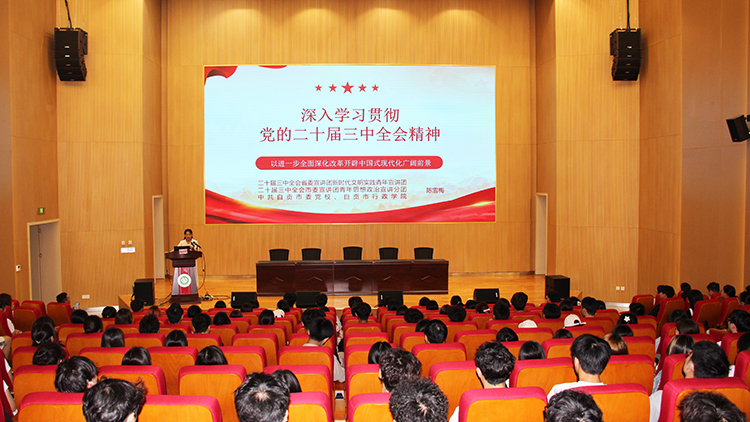 9月6日上午,由校团委和自贡团市委联合组织开展的学习贯彻党的二十届三中全会精神学习宣讲报告会在李白河校区尚艺馆104报告厅举行。自贡市委宣讲团青年思想政治宣讲分团成员、中共自贡市委党校青年讲师陈雪梅为同学们送上了一堂全会精神宣讲解读课,我校200余名团员青年代表参加报告会。