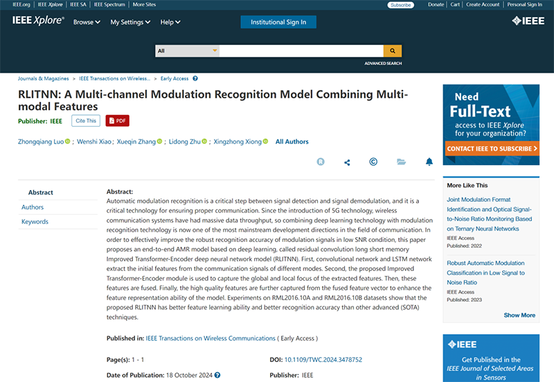 近日,自动化与信息工程学院“智能无人系统技术研究”652科研创新团队成员骆忠强教授在信息通信领域国际权威期刊《IEEE Transactions on Wireless Communications》上发表了题为“RLITNN: A Multi-channel Modulation Recognition Model Combining Multi-modal Features”的研究论文,提出了一种基于深度学习的全新自动调制识别模型,有效提升了低信噪比环境下调制信号的识别精度。