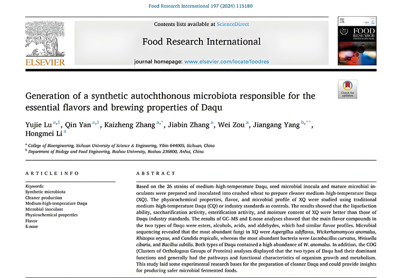 近日,生物工程学院“白酒资源微生物与大数据”科研团队张楷正教授在《Food Research International》(中科院一区,Top,IF5=7.4)上发表题为 “Gen-eration of a synthetic autochthonous microbiota responsible for the essential flavors and brewing properties of Daqu”的实验研究论文,四川轻化工大学生物工程学院为论文第一署名单位。该研究得到了四川省重点研发计划项目的支持。