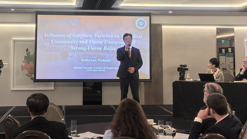 在酒类风味研讨阶段,罗惠波首先介绍了学校的基本情况。他表示,学校围绕白酒产业布局了“从一粒种子到一滴白酒”的学科专业体系,希望与有关高校展开更加务实高效的国际合作,共同推动中国白酒产业高质量发展。会上,罗惠波作题为“Influence of Sorghum Varieties on Microbial Community and Flavor Component of Strong-Flavor Baijiu”的主题报告。报告聚焦酿酒高粱与白酒风味关系这一科学问题,分别从原料精细结构解析、感官组学分析、多组学联合分析等方面深入阐释酿酒高粱对白酒风味及品质的调控机制,为解析酿酒专用粮提供了新视角、新参考。报告受到与会专家广泛关注和热烈研讨。俄勒冈州立大学食品风味团队认为,该报告瞄准产业发展核心问题,选题新颖,研究方法先进,希望加强与我校的交流合作,共同解决技术难题。Michael Qian教授关心脂质组的检测进展,希望双方能在风味检测和相互关系等领域深入研讨。