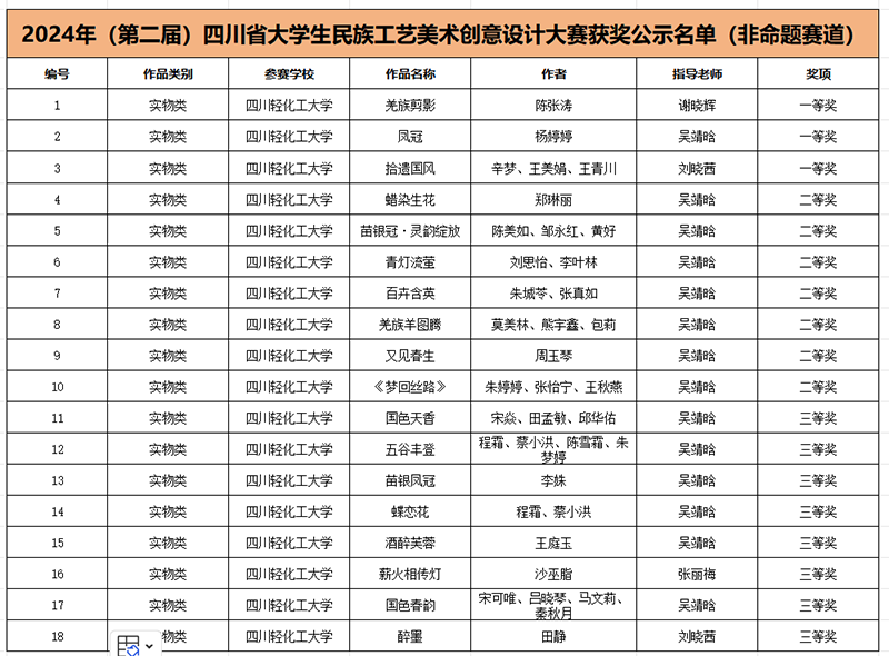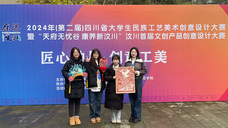 本次比赛旨在全面贯彻落实党的二十大精神,大力弘扬中华优秀传统文化,推动非物质文化遗产创造性转化和创新性发展,助力四川文旅产业结构调整和升级。此次赛事分非命题赛道和政府命题赛道两个赛道,组委会共收到来自四川省内外79所高校共计3138个参赛队伍的作品,参赛人数10122人次。我校教育心理科学学院积极动员、精心组织,共有43个作品参加此次比赛。由谢晓辉老师指导的陈张涛同学作品《羌族剪影》、吴靖晗老师指导的杨婷婷同学的作品《凤冠》、刘晓茜老师指导的辛梦同学的作品《拾遗国风》荣获非政府命题赛道实物类一等奖。谢晓辉、吴靖晗、刘晓茜三位老师获得优秀指导老师称号。
