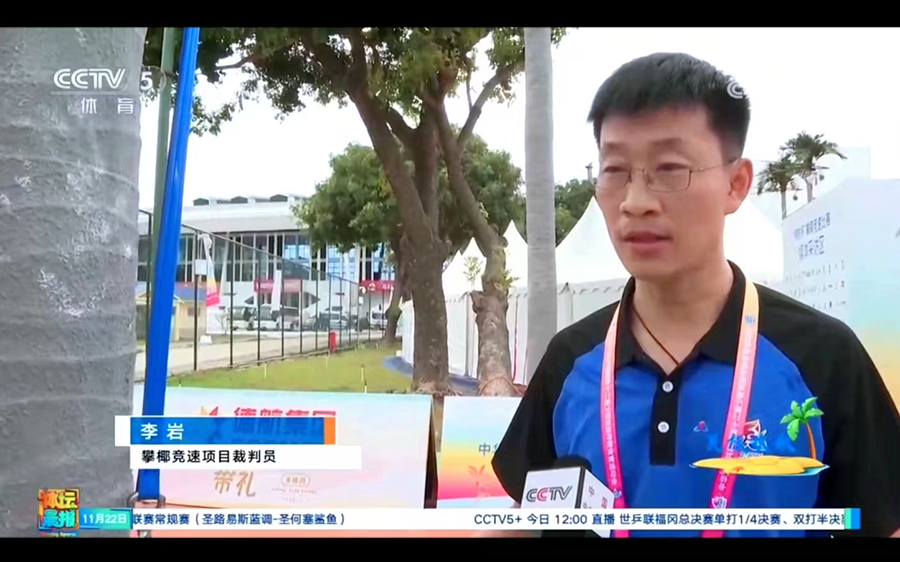 在11月22日至30日举行的全国第十二届少数民族传统体育运动会上,我校体育学院教师李岩受邀担任攀椰竞速项目的裁判并受到央视CCTV-5套节目的采访。赛场上,李岩老师立足自身岗位,履职尽责,严格执裁,以良好精湛的业务能力和认真负责的工作态度,圆满完成了参与赛事的裁判工作任务,展示了我校体育教学团队较高的专业素养和职业操守,得到了同行与赛事组委会的高度认可与一致好评。
