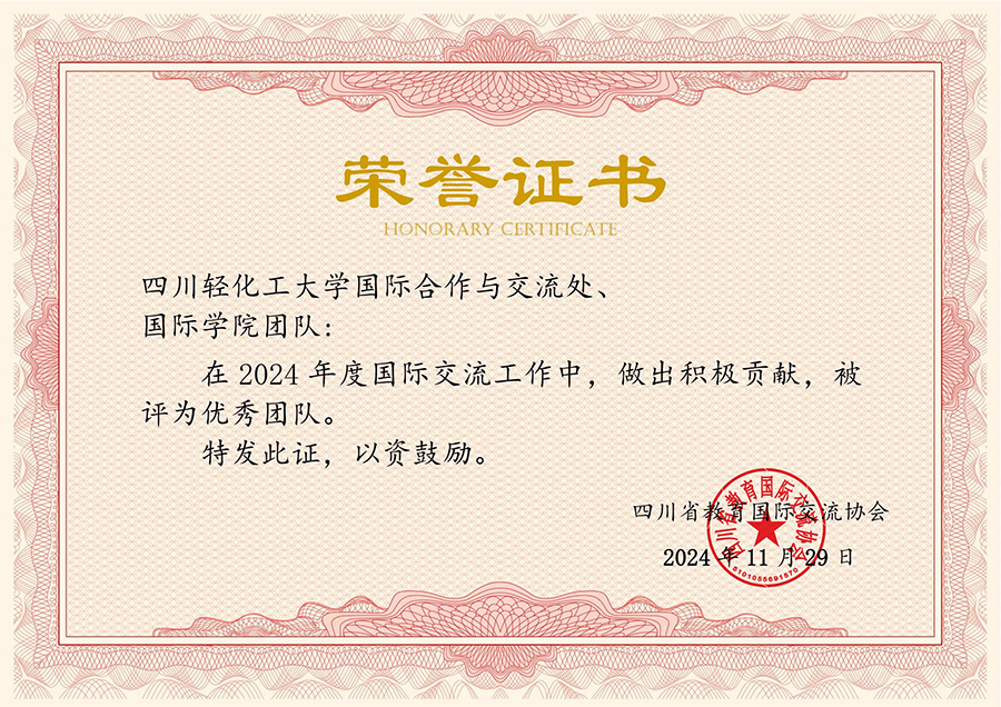 近日,四川省教育国际交流协会在全省范围内对2024年度国际交流成果丰硕、成效显著,积极促进了教育国际化的团队开展评选,我校国际合作与交流处、国际学院被评为“2024年度优秀团队”。