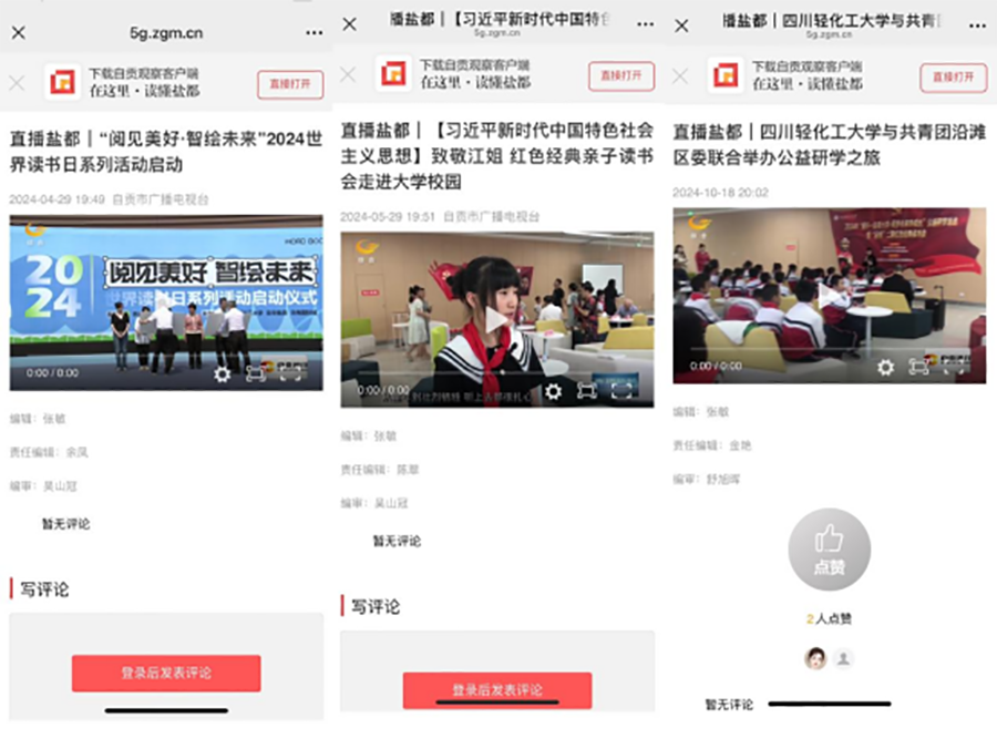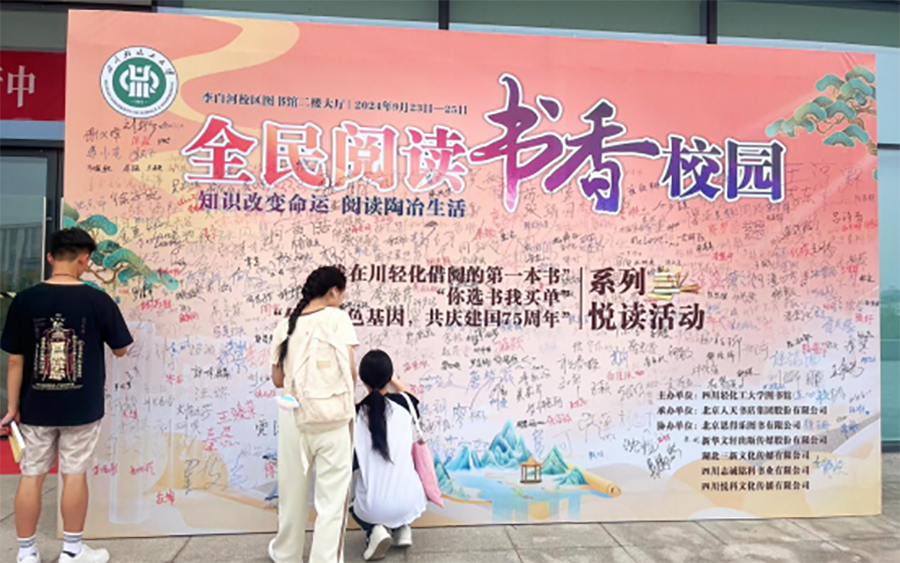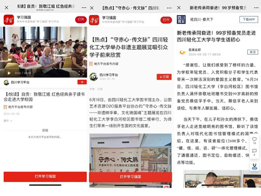 图书馆将书香校园建设作为重点工作,持续开展形式多样的阅读推广活动,培养学生爱读书、读好书、善读书的良好习惯,成为弘扬中华优秀传统文化的重要阵地。举办“4.23”世界读书日暨四川轻化工大学阅读文化节、“我在川轻化借阅的第一本书”迎新活动、“走进学术·热爱学术”学术沙龙交流会、“数聚未来嘉年华”数据库会展、“闲来弄风雅”——琴棋书画国粹艺术展、“守赤心·传文脉——非遗映华章,文化铸国魂”主题展览、“庆祝中华人民共和国成立75 周年”主题知识竞赛、2022~2024年大学生信息素养大赛、川渝地区“图书馆杯”全民英语口语大赛、“寻找校园最美读书人”评选活动、“致敬江姐,赓续红色血脉”亲子读书会、2024年“童你一起看大学·筑梦未来伴成长”公益研学活动、“用知识谱写辉煌,用感恩回报社会”乡村振兴活动等(图1~7)。其中多个活动被国家级、省级及地方媒体平台进行了报道(图8~11)。图书馆通过“品悦”读书会品牌建设、学术交流、文化传承、竞赛活动、乡村振兴及公益活动等多种形式,发挥了图书馆育人功能以及服务社会的职能,多次获得“优秀组织单位奖”、“最佳组织单位奖”等,为推动全民阅读作出了贡献。