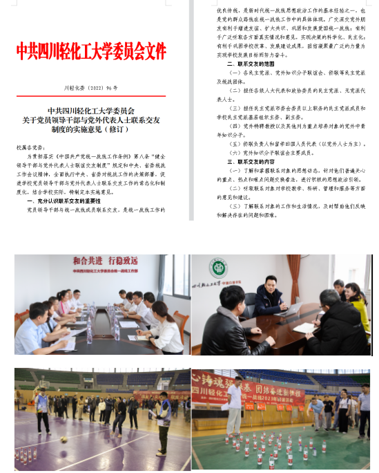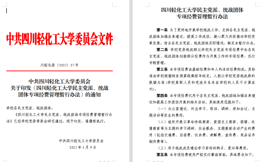 制定《四川轻化工大学民主党派、统战团体专项经费管理暂行办法》,经费实行党派、团体负责人专账管理,发放工作津贴,不断夯实统战工作基础。