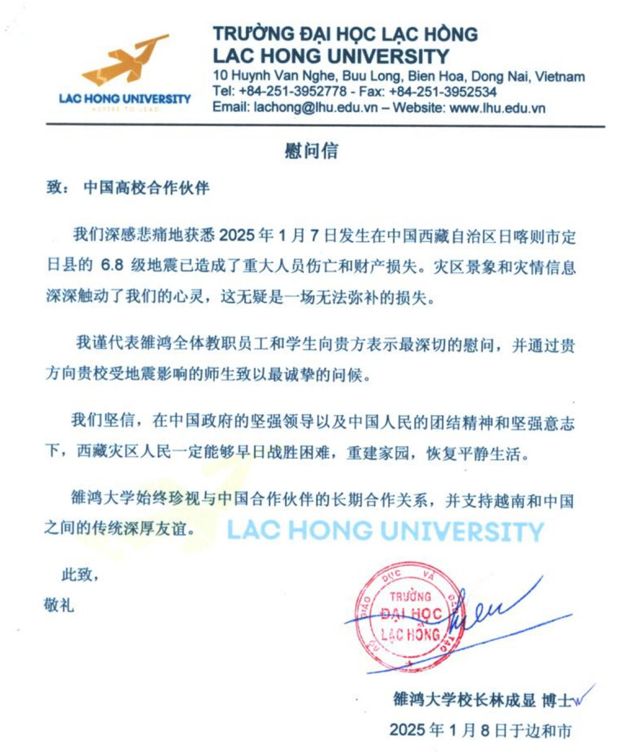 就西藏定日县近日发生的6.8级强震,学校收到了来自越南合作高校——越南雒鸿大学的慰问信件,诚挚表达了雒鸿大学对于此次自然灾害中受到影响的师生以及当地居民的深切关怀和同情。