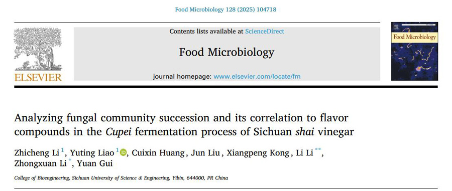 2024年12月28日,生物工程学院“调味品及食品加工副产物资源化利用”652科研创新团队在《Food Microbiology》(中科院一区,TOP,IF=4.5)上发表题为“Analyzing fungal community succession and its correlation to flavor compounds in the Cupei fermentation process of Sichuan shai vinegar”的研究论文。四川轻化工大学2023级研究生李治城、廖钰婷博士为论文第一作者,李丽教授、李仲玄博士为论文通讯作者,该研究工作得到了四川轻化工大学科研创新团队计划(SUSE652B003)的支持。