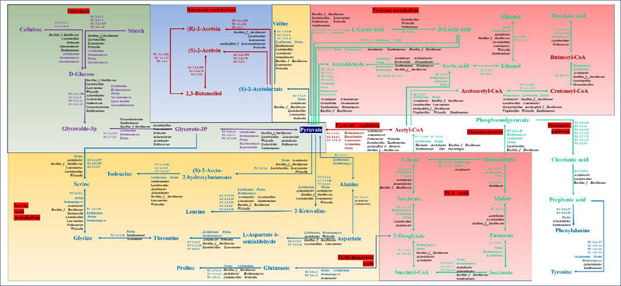 醋醅中微生物的种类、数量和代谢途径在很大程度上决定了醋的风味。本研究利用高通量测序技术,初步确定了四川晒醋固态发酵阶段参与风味物质代谢的真菌。相关分析表明,多种真菌与有机酸、氨基酸、挥发性风味物质呈显著正相关。宏基因组技术进一步分析出醋醅中Lichtheimia、Brettanomyces、Pichia、Saccharomyces、Kazachstania和Syncephalastrum是数量最多的真菌属,同时相关分析显示,20种真菌与11种有机酸、24种真菌与16种氨基酸、50种真菌与76种挥发性风味化合物呈显著正相关。值得注意的是,Lichtheimia、Pichia、Brettanomyces和Kazachstania是对风味代谢影响最大的真菌。此项研究为四川晒醋中微生物及风味物质分析提供了依据,揭示了固态发酵过程中菌落及风味物质的演替规律,为进一步研究四川晒醋中真菌群落在生产中的潜在应用奠定了基础。