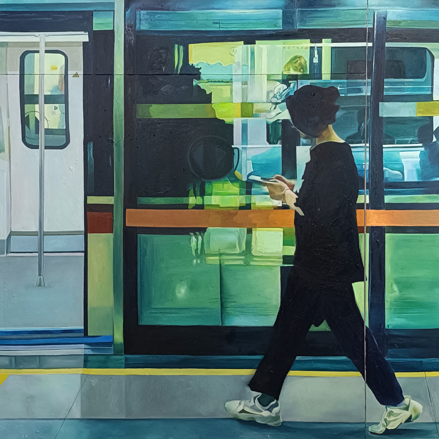 我校入选作品《城市节奏》聚焦于一位身着黑衣的女性,她手持手机,步履匆匆,穿梭在繁华的都市街道中,生动地展现了现代都市人的忙碌与专注,成为信息爆炸时代都市生活快节奏的缩影。背景中的地铁列车和车厢内若隐若现的乘客,进一步强化了都市现代化的氛围。整幅画作色彩鲜明,线条流畅,充满了现代感。它不仅仅是一幅描绘都市生活的画作,更是对城市发展和都市现代化进程的一种思考。通过这幅画,传递出都市生活的快节奏和繁忙,同时也展现出城市发展带来的无限可能和机遇。