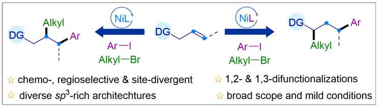 鉴于烯烃具有两个潜在的官能化位点,可以快速构建各种富含C(sp3)的结构,因此烯烃已被公认为是构建复杂分子的理想底物之一。通过改变最少的催化参数实现烯烃的区域选择性和位点发散性转化是快速、精准构建不同复杂结构的有效方法。然而,精准控制烯烃的区域选择性和位点发散性转化仍然具有很大的挑战性。本研究开发了一种镍催化未活化烯丙基胺的区域选择性和位点发散性1,2-和1,3-亲电交叉芳基烷基化反应;特别是发展了首例还原条件下烯烃的迁移1,3-芳基烷基化反应。该策略具有优异的化学、区域和位点选择性,兼容各种具有不同空间效应和电性效应的末端/内部烯丙基胺、芳基卤化物和烷基卤代物。该反应能够从相同的起始原料出发直接高效地合成多种不同富含C(sp3)的支链脂肪胺。
