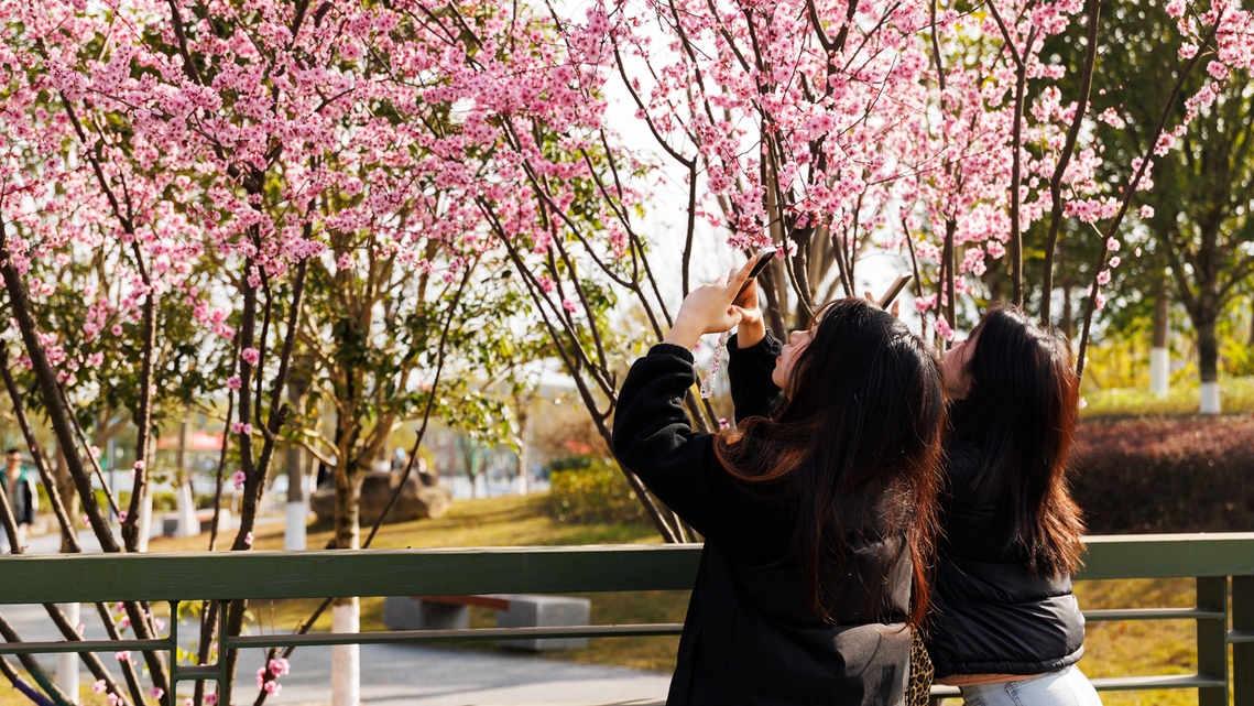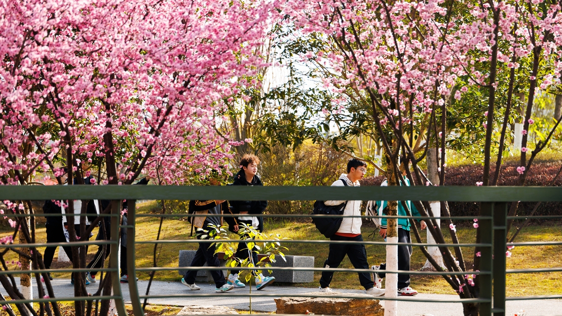 与此同时,校园内春日美景如画。李白河校区的樱花悄然绽放,粉色的花瓣随风飘舞,与现代化的教学楼相映成趣;宜宾校区新绿的草坪为校园增添了一抹亮丽的色彩;汇东校区的洋紫荆焕发出新的生机,在春日的照耀下,充满了生机与活力。