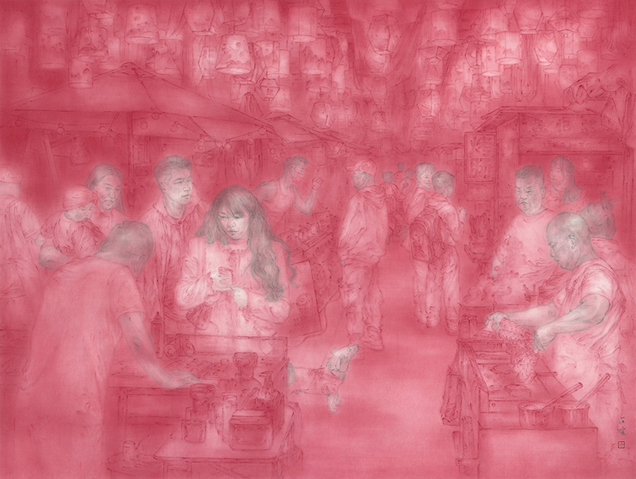 《华灯初上》以自贡夜市为载体,通过彩灯艺术与川渝小吃场景,全景式展现城市经济活力与民生图景。作品采用焦点透视强化视觉张力,运用水墨技法实现静谧氛围与市井烟火气的艺术平衡,人物刻画兼具写实感和亲切感。