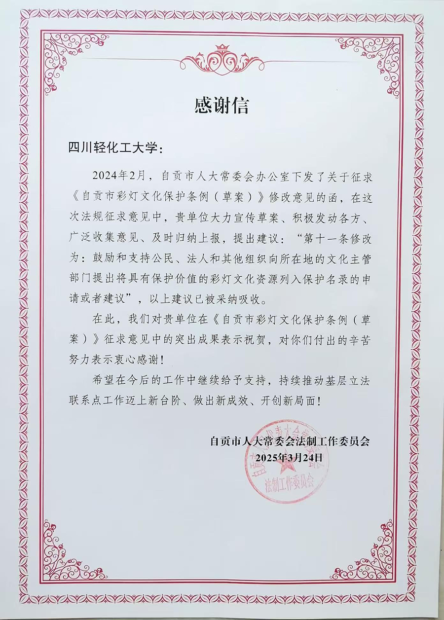 近日,自贡市人大常委会法制工作委员会向我校基层立法联系点发来感谢信,对我校法学院副教授曾凡珂作为自贡市首席法律咨询专家提出的立法建议予以采纳。在2024年2月《自贡市彩灯文化保护条例(草案)》征求意见过程中,曾凡珂代表基层立法联系点提出的鼓励公民、法人和其他组织向文化主管部门提出彩灯文化资源保护名录申请或建议被写入条例。