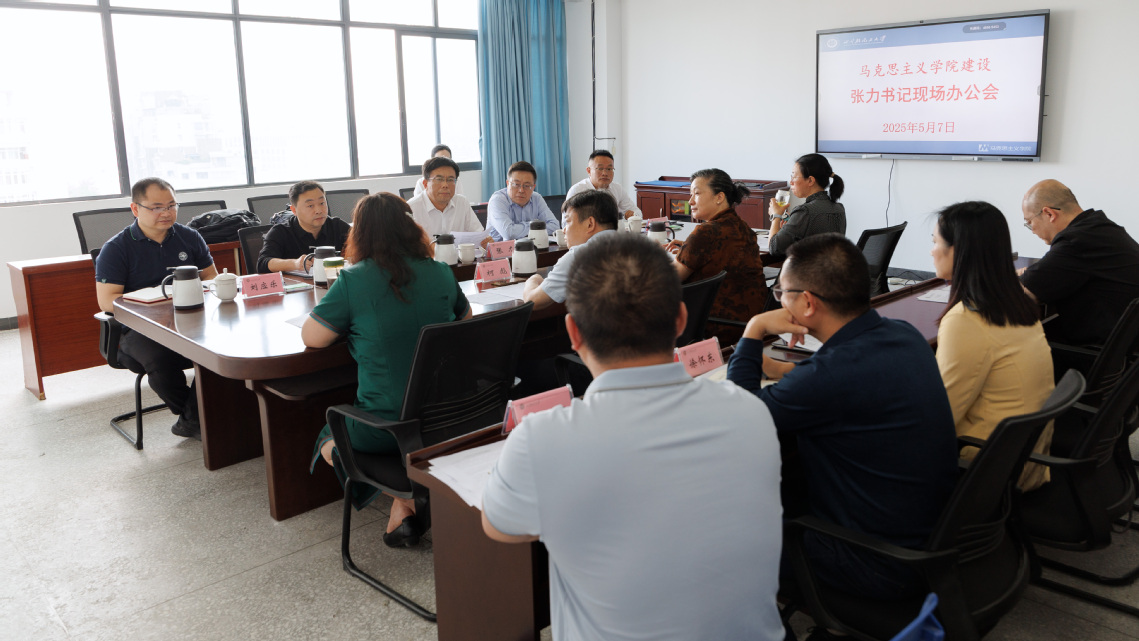 5月7日,党委书记张力率学校党政办、组织部、宣传部、教务处相关部门负责人到马克思主义学院召开现场办公会。马克思主义学院处科级干部、教研室主任及部分教师代表参加会议。会议由马克思主义学院党委书记王建琼主持。