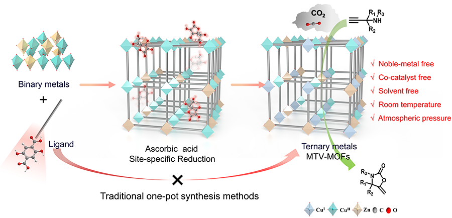 该论文提出一种新颖的特定位点还原策略,通过精准调控金属有机框架(MOFs)中特定节点处金属离子的氧化还原性质,突破传统合成方法在多金属组合方面的固有局限,为多元金属有机框架(MTV-MOFs)中多金属元素组合的拓展提供全新思路。基于此策略制备的多金属MOF材料CuⅠCuⅡZn-DOBDC,集三元金属活性位点于单一框架,并富集高密度未配位羟基,构建出具有多重协同催化效应的非均相催化剂。得益于多元活性位点的高效协同催化效应,该催化剂在常温常压下无需溶剂和助催化剂,即可实现炔丙胺与二氧化碳的绿色转化。本研究为拓展多金属MTV-MOFs体系,将更多所需类型的金属离子整合到单一MOF中提供新思路,更以环境友好的催化体系为CO2资源化利用及绿色化学合成开辟新路径。