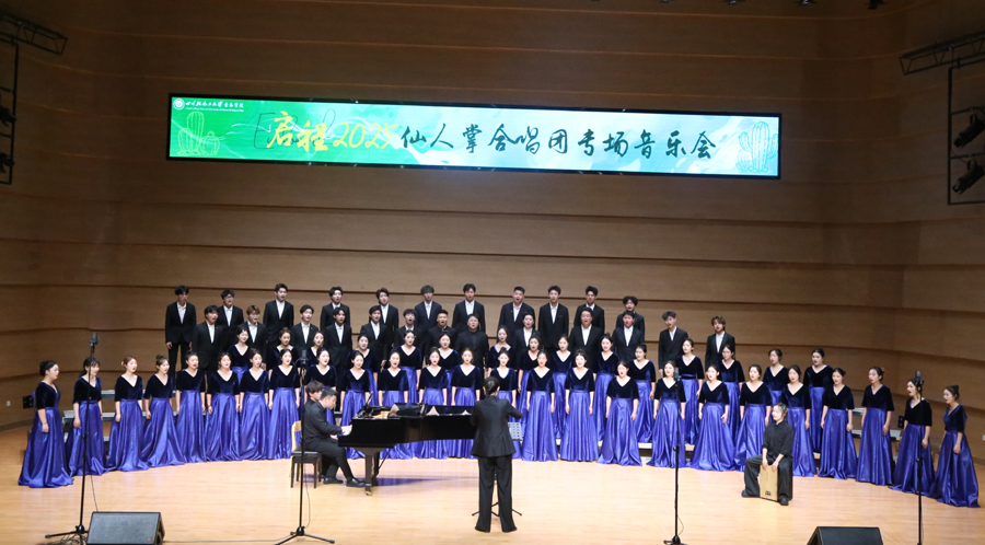音乐会以团歌《仙人掌》开场。这支成立于2015年,拥有80余名团员并屡获省级以上奖项的团队,精选16首中外经典,展现了多元艺术表现力。特邀教师嘉宾胡东明、杨文等与学生团体联袂献艺,《阿里郎》《春花秋月何时了》等曲目赢得热烈掌声。