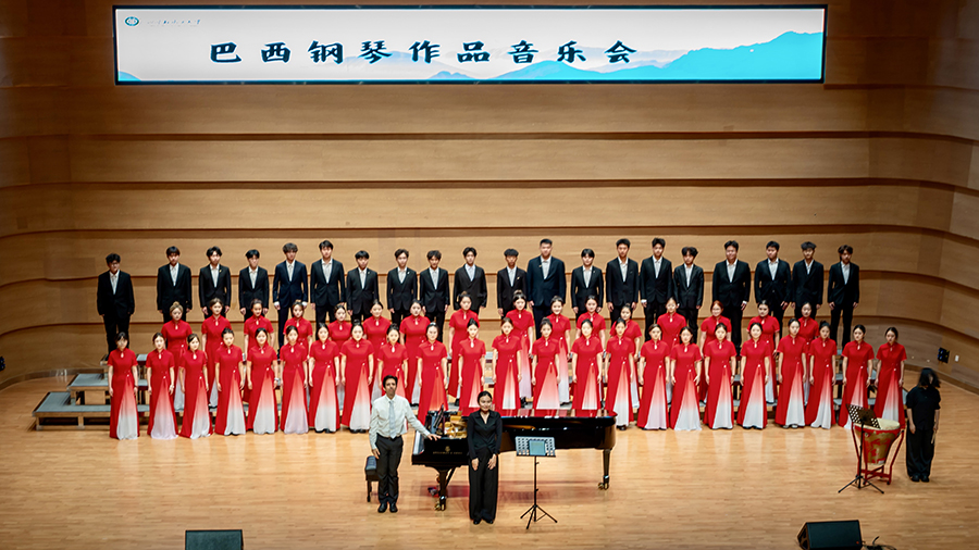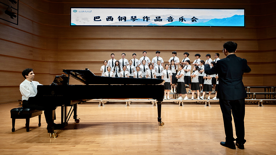 音乐会上,杜瓦尔•塞塞蒂演绎《舞会》《小奏鸣曲》等巴西经典钢琴作品;葡萄牙语专业学生朗诵诗歌《编织早晨》、合唱《月光圆舞曲》;音乐学院学生演奏《春江花月夜》,仙人掌合唱团与杜瓦尔合作的《天府农桑耕作图》将现场气氛推向高潮。