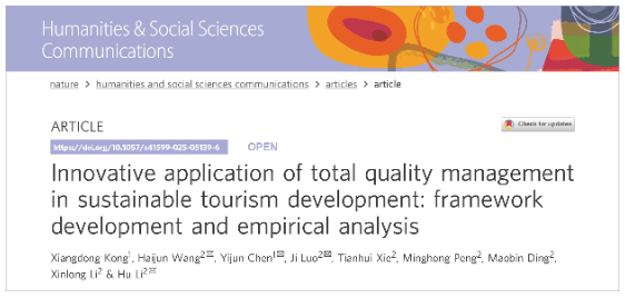 近日,经济学院智慧旅游科研团队依托旅游管理专业通过跨学院进行学科交叉融合,在Nature子刊《Humanities & Society Science Communications》发表最新研究成果“Innovative Application of Total Quality Management in Sustainable Tourism Development: Framework Development and Empirical Analysis”。该研究得到了四川省文化和旅游厅科研课题与国家地理信息系统工程技术研究中心开放基金共同资助。(作者:孔祥冬、王海军*、罗洎*、谢天慧、彭明鸿、丁茂斌、李辛龙、李虎* 等)