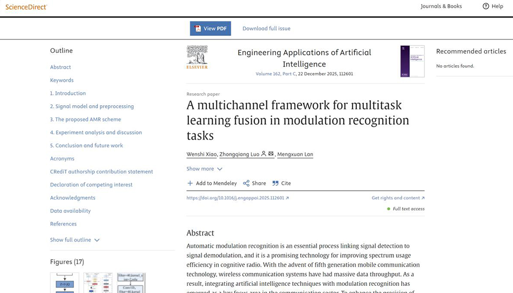 近日,我校“智能无人系统技术研究”652科研创新团队成员骆忠强教授在计算机科学领域国际顶级期刊《Engineering Applications of Artificial Intelligence》(影响因子8,中国科学院一区TOP期刊)发表学术论文,题为 “A multichannel framework for multitask learning fusion in modulation recognition tasks”。骆忠强教授为通讯作者,其指导的研究生肖文诗为第一作者,我校为独立第一完成单位。