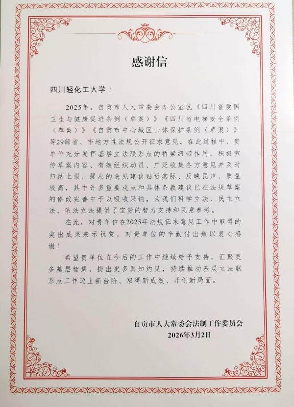 调研座谈中,黄河首先对四川轻化工大学基层立法联系点2025年在自贡市地方立法工作中作出的突出成绩予以高度肯定,并代表自贡市人大常委会法制工作委员会为联系点颁发感谢信,肯定其在汇聚民智、服务地方法治建设中的积极贡献。黄河表示,四川轻化工大学充分发挥学科与人才优势,已成为自贡地方立法工作的核心智库,为推进科学立法、民主立法、依法立法提供了坚实智力支撑。他希望双方持续深化沟通协作,推动高校专业优势与地方立法需求精准对接,助力联系点发挥更大效能。
