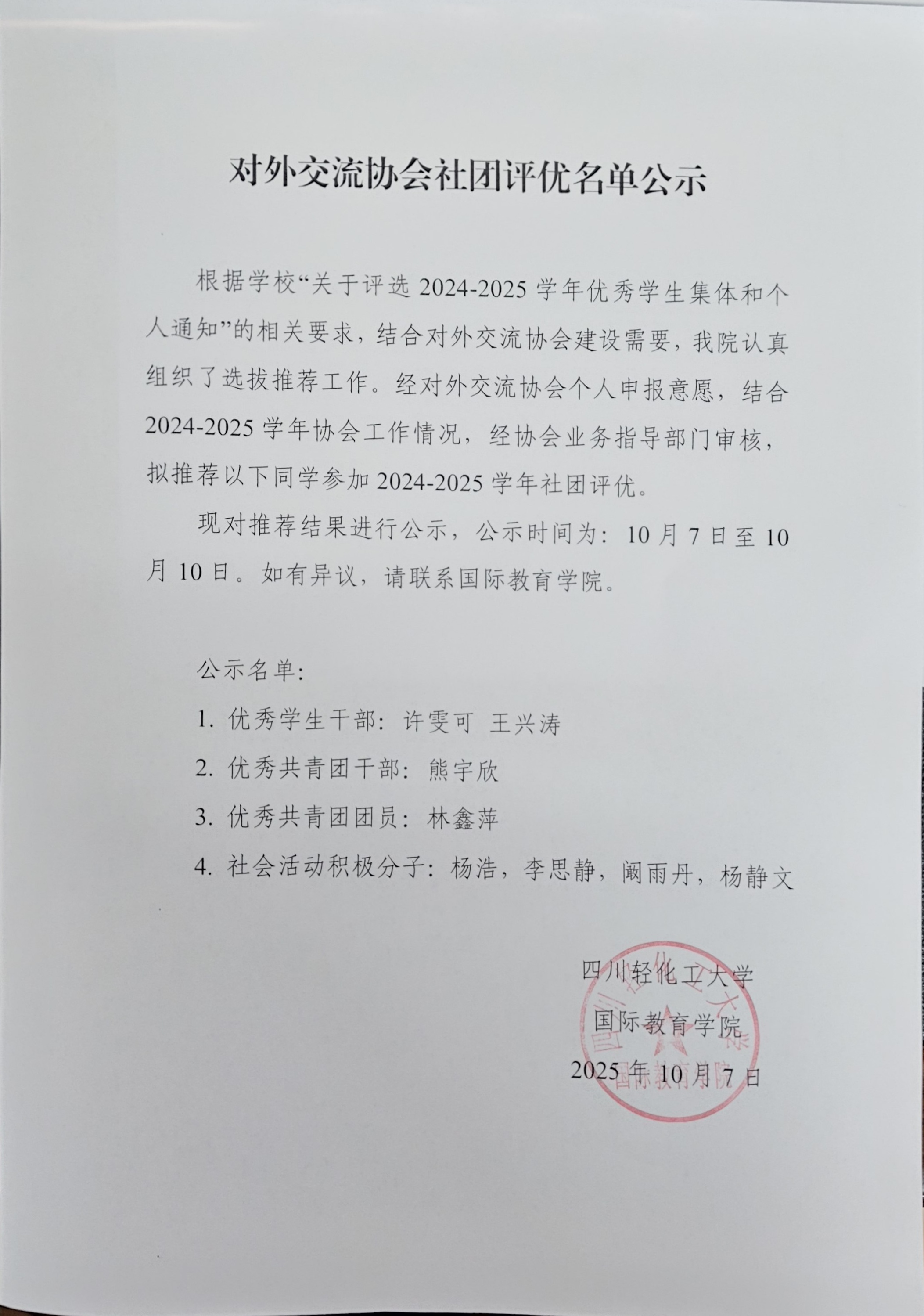 根据学校“关于评选2024-2025学年优秀学生集体和个人通知”的相关要求,结合对外交流协会建设需要,我院认真组织了选拔推荐工作。经对外交流协会个人申报意愿,结合2024-2025学年协会工作情况,经协会业务指导部门审核,拟推荐以下同学参加2024-2025学年社团评优。