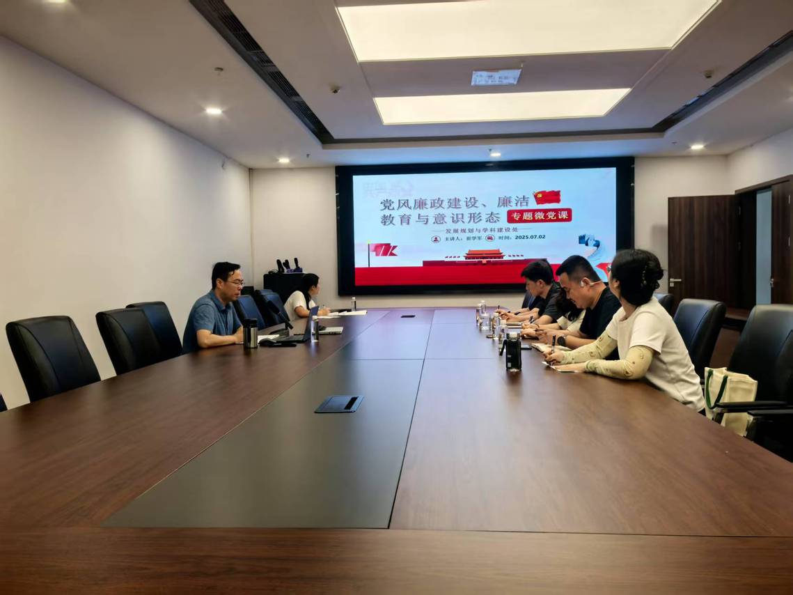 2025年7月2日下午14时,发展规划与学科建设处党支部在李白河校区办公中心10-2会议室组织召开专题微党课学习会。本次党课以“党风廉政建设、廉洁教育与意识形态”为主题,由支部书记崔学军同志主讲,支部全体党员6人及其他工作人员2人参加学习。
