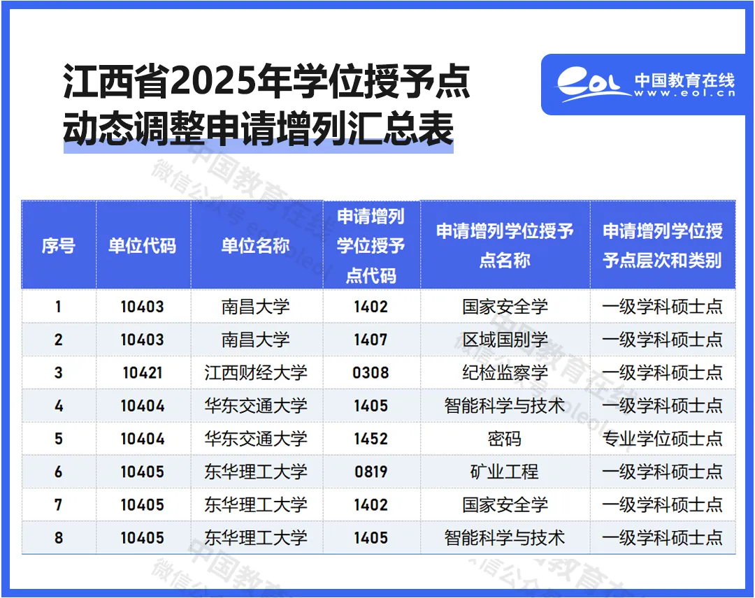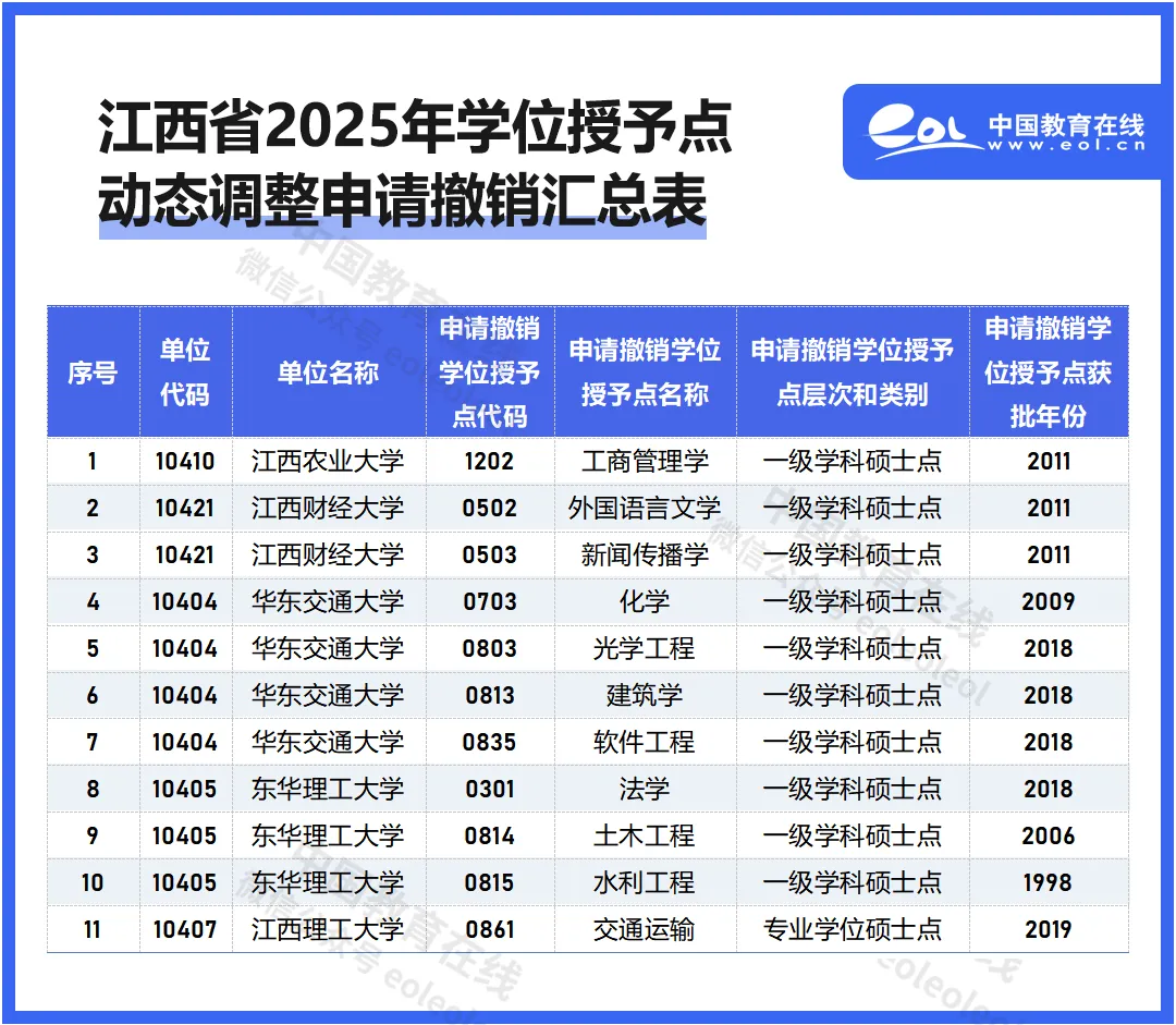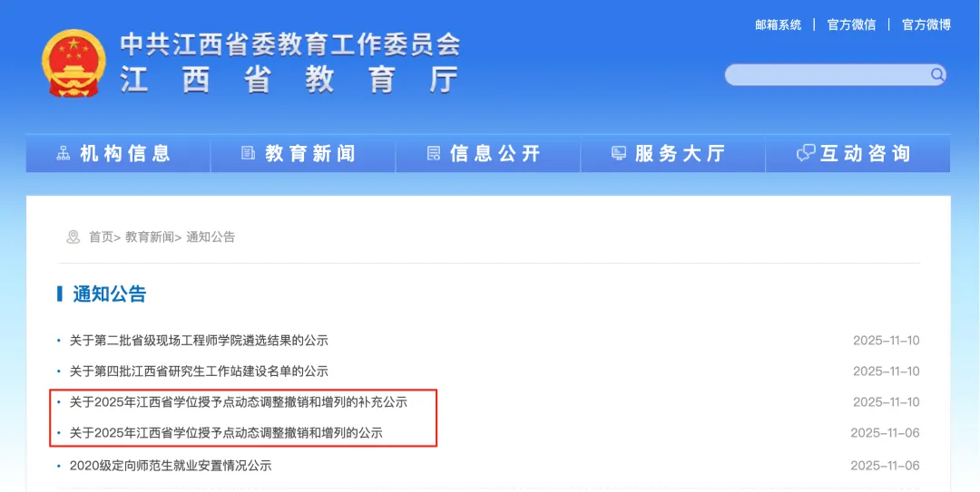 近日,江西省教育厅发布《关于2025年江西省学位授予点动态调整撤销和增列的公示》、《关于2025年江西省学位授予点动态调整撤销和增列的补充公示》。
