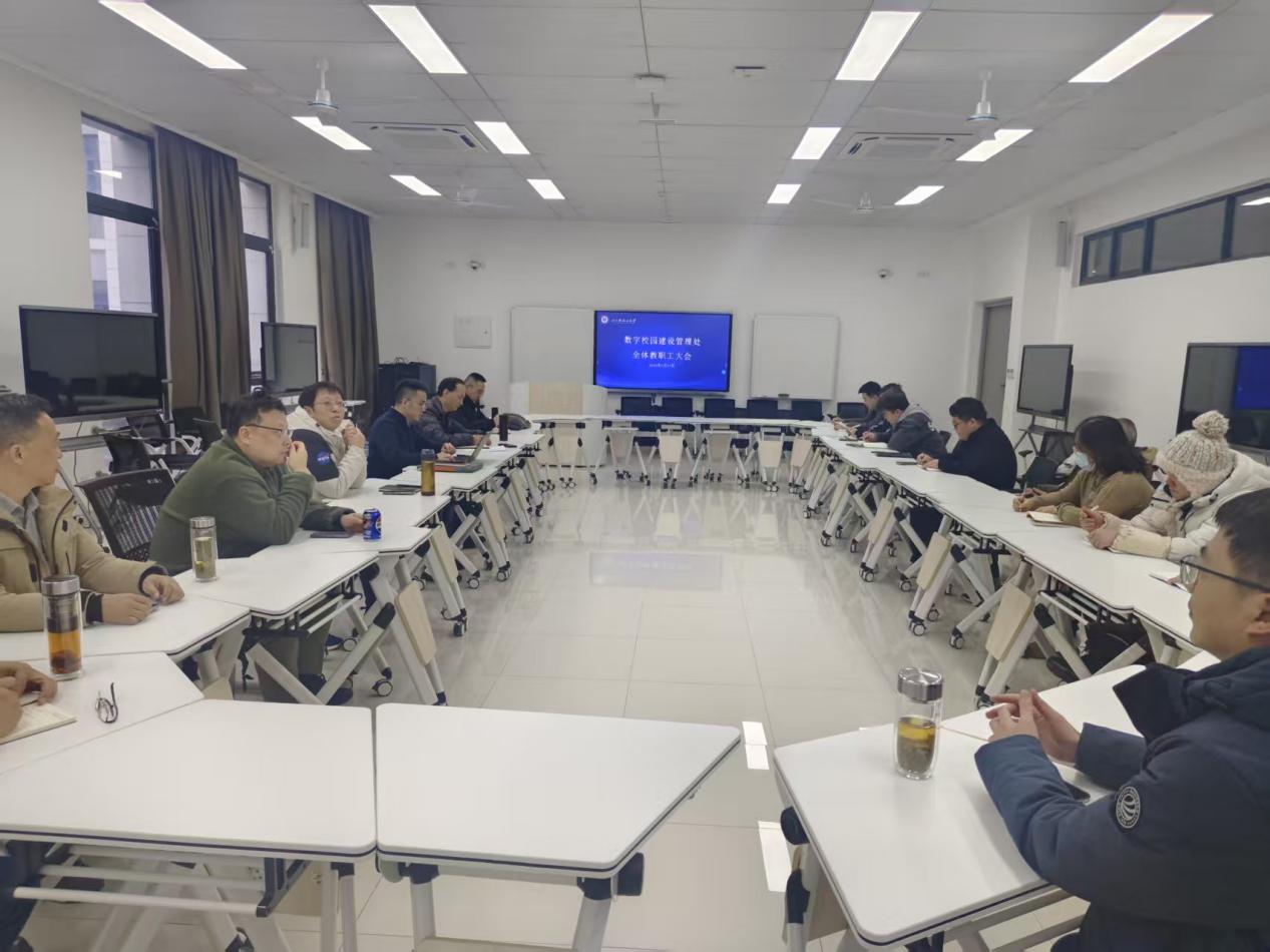 2026年1月16日下午,数字校园建设管理处在李白河校区博学楼H1-307召开全体教职工大会,部门负责人石睿主持会议,全体教职工参会。