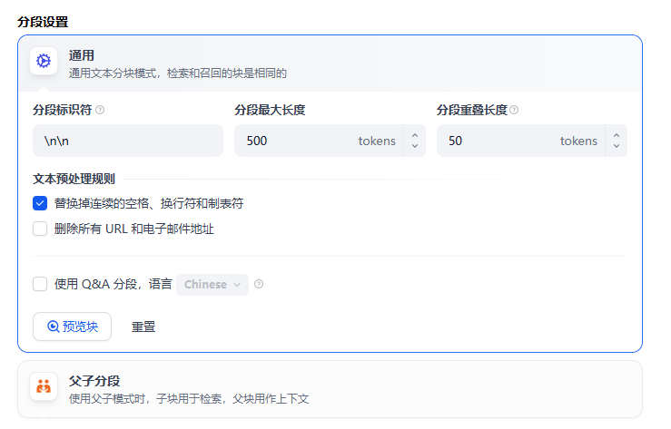 下一步进行文本分段和清洗,分段有两种模式,通用模式和父子模式,应根据不同的文本类型和内容选择不通的模式。通用模式适用于结构简单、内容独立的文本场景,如FAQ问答集、产品说明书条目或新闻摘要,这些场景下每个分段自成语义单元,无需上下文关联;而父子模式更适合具有层级结构的复杂文档,如学术论文(章节与段落)、法律条文(条款与细则)或技术手册(模块与子功能),通过父子关系保留逻辑关联性,确保检索时能自动携带上级上下文,提升专业领域答案的完整性。我们这里以本校简介这一文本为例,使用通用模式即可。
