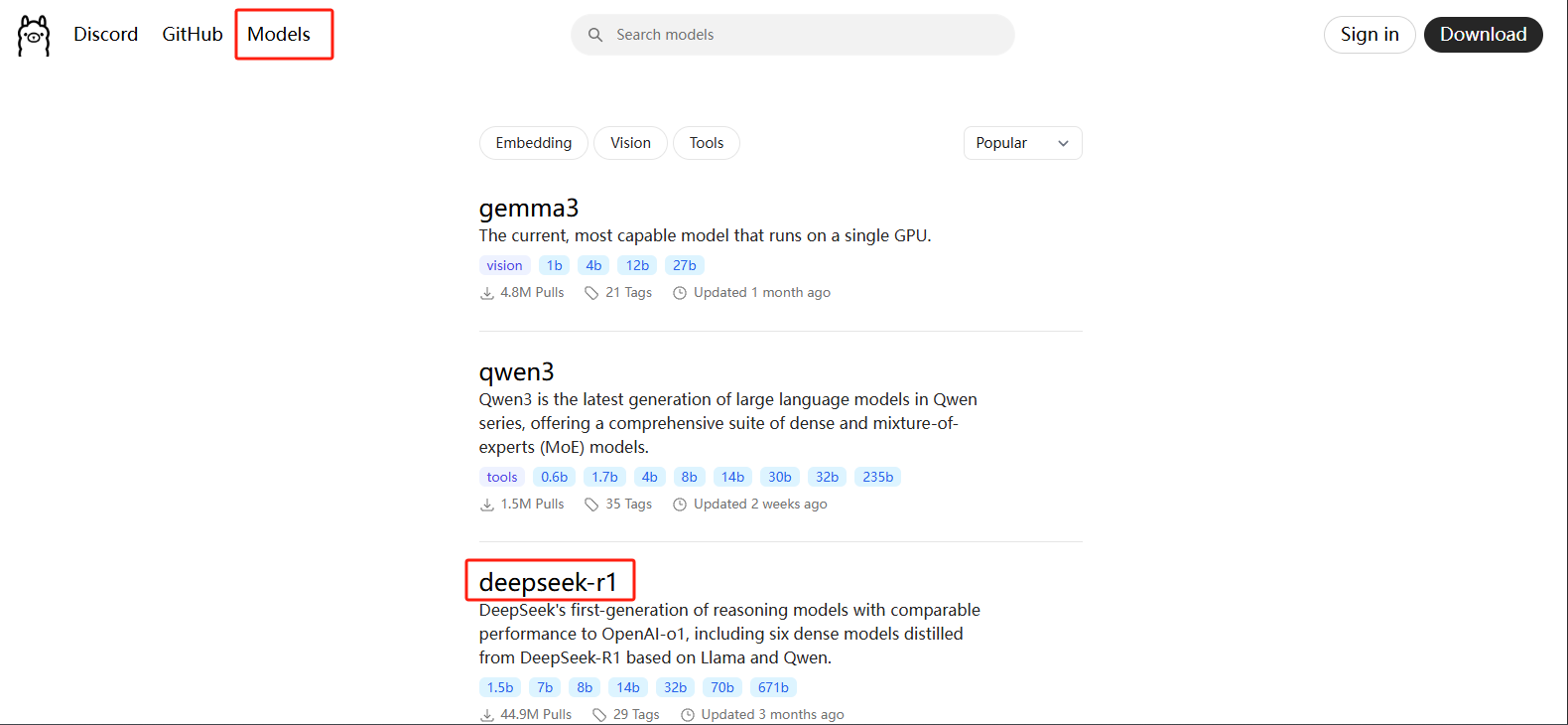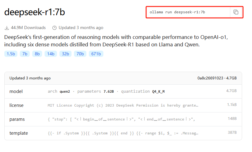 首先在ollama官网点击模型、再选择想要部署的模型,这里我们选择deepseek-r1
