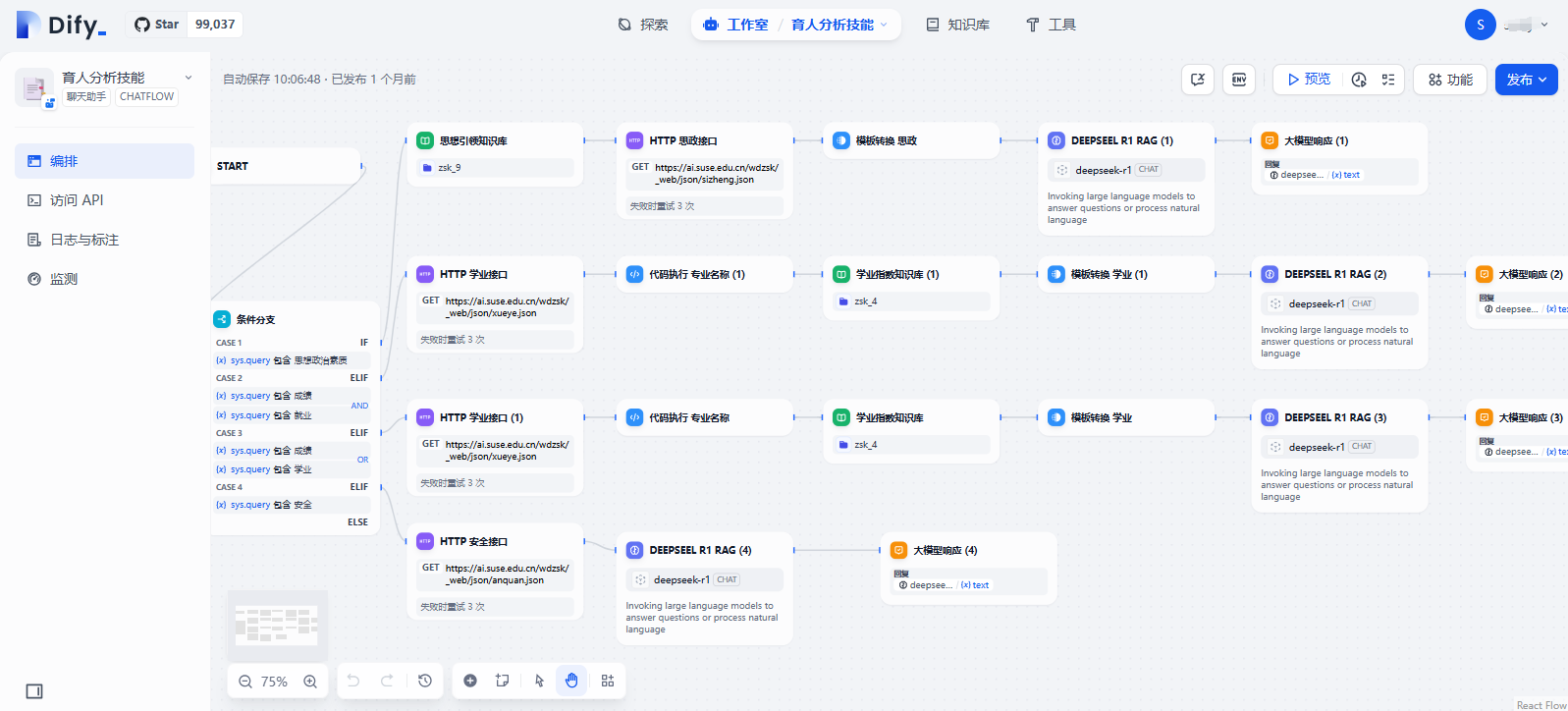 除了这种简单的普通聊天助手外,还可以创建对话流chatflow,它与普通聊天助手的核心区别在于:对话流通过可视化流程设计支持多分支交互(如条件跳转、分阶段输出),适合医疗问诊等需动态决策的复杂场景;而聊天助手仅能处理线性对话,适用于简单问答。技术上,对话流允许工具链组合调用(如多API串联)并保留对话状态,开发时需用画布编排节点;聊天助手则依赖提示词配置,功能局限于单轮响应和基础工具调用。如下图所示,是一个关于育人分析的对话流,会根据用户输入的关键词进行不同的对话交互,具体的制作流程可以结合教学视频进行上手实操,dify使用的低代码的模式,通过在画布上拖拽节点和配置节点实现功能,实现起来并不复杂。