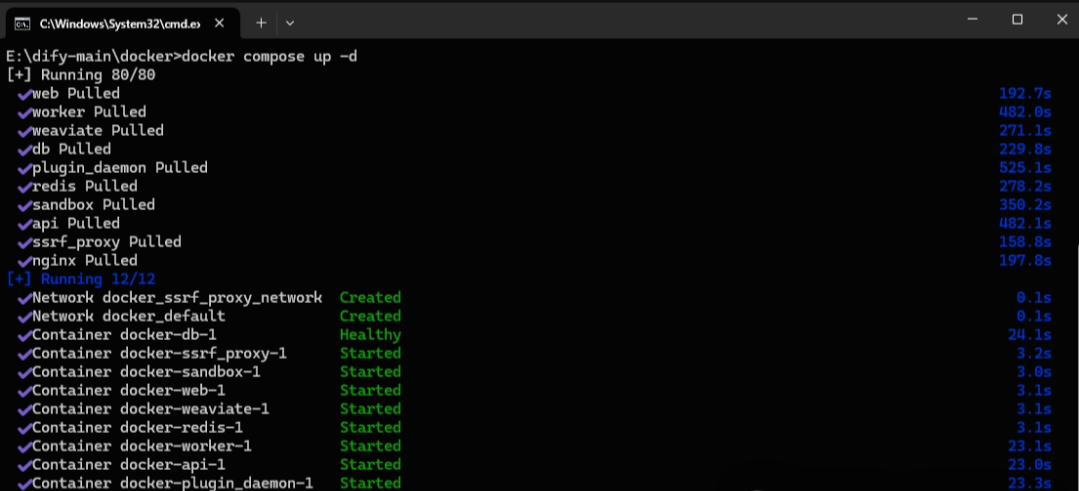 完成文件改名后,在文件夹内打开cmd,注意一定是在文件夹内打开,或者也可以通过之前的方式打开cmd,然后通过cd /d +路径 的方式转到该文件夹。在cmd中输入docker compose up -d并回车,通过docker compose部署Dify,Docker会自动拉取Dify所需的依赖。