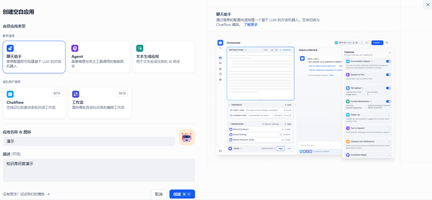 目前dify支持聊天助手、智能体、对话流和工作流这些应用,在不同的场景中应使用不同的应用,以刚才创建的知识库为例,如果只是想做一个基于知识库的问答小助手,则直接选择聊天助手进行创建。