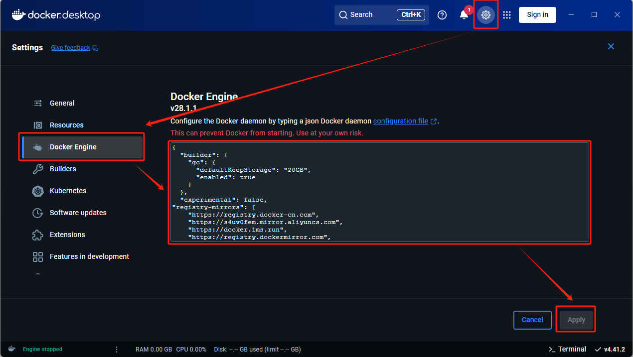 打开Docker的软件界面,点击设置,进入到Docker Engine,在右边添加以下内容,输入完成后点击应用(Apply&restart) 此时再在cmd中输入docker compose up -d命令,等待安装完成即可。