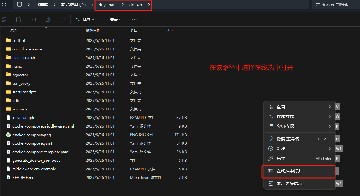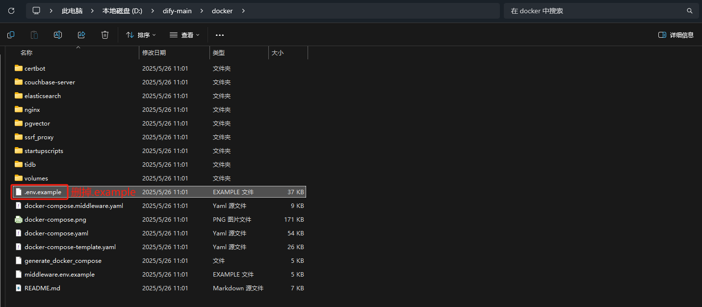 下载下来的文件是一个叫dify-main的压缩包,解压到磁盘里并进入到docker文件夹内,把.env.example文件名改为.env