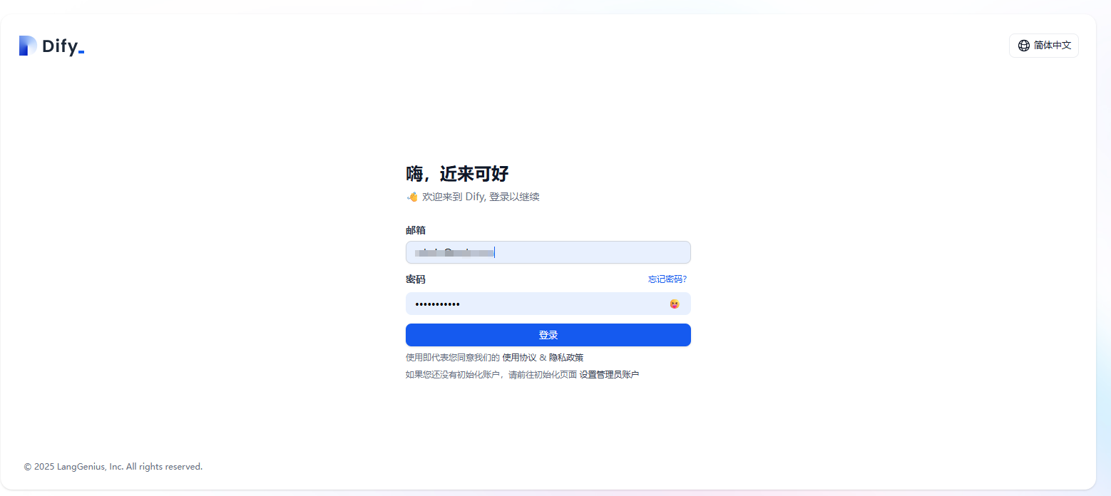 安装完成后,在浏览器输入http://localhost/install访问并配置Dify,进行注册后就可以登录了。