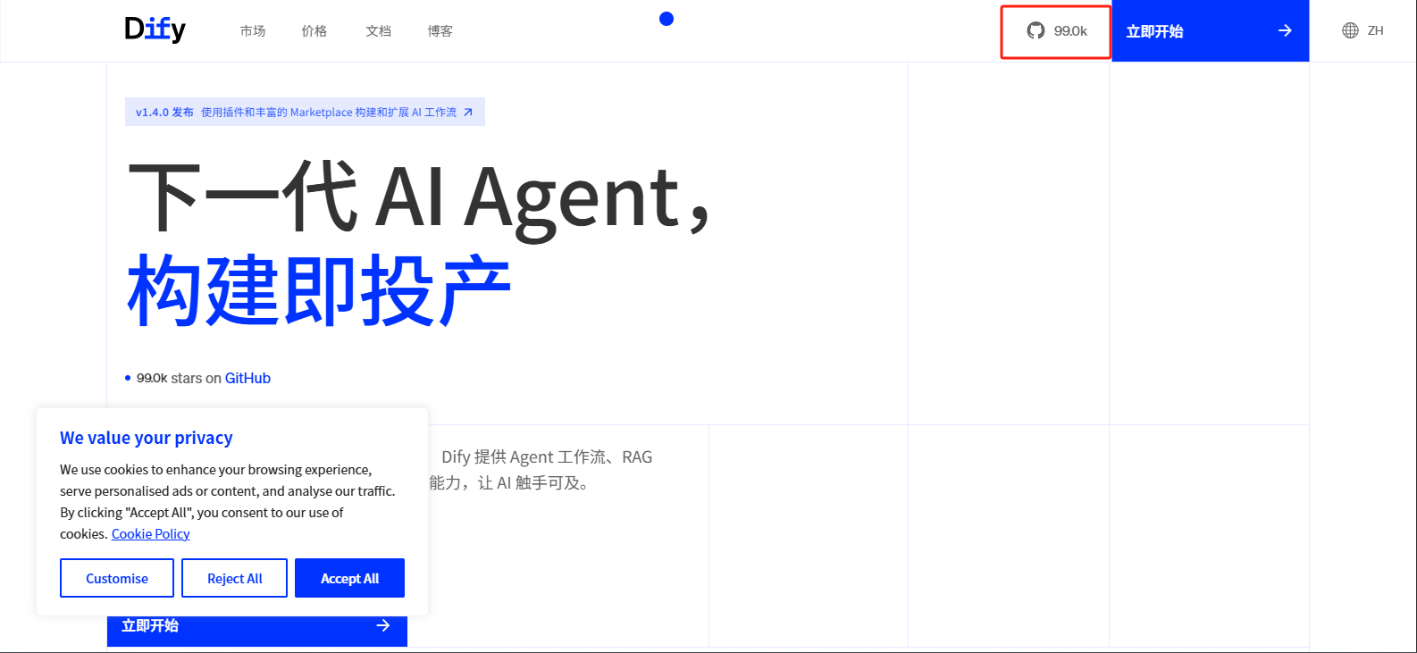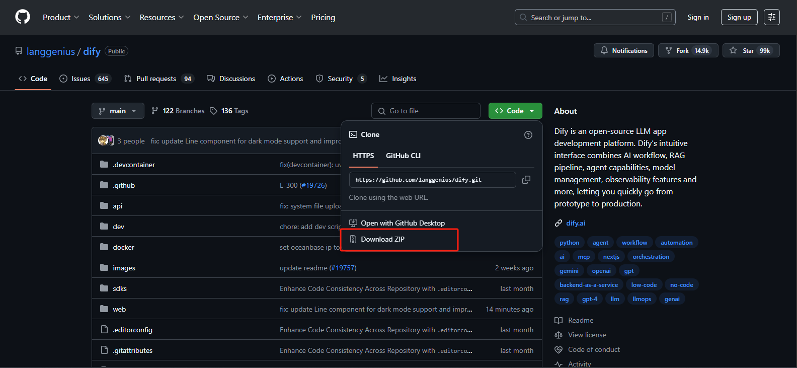 首先进入Dify官网https://dify.ai/zh,点击GitHub,在GitHub页面中点击Download ZIP下载项目文件(Github不稳定,推荐使用代理)。