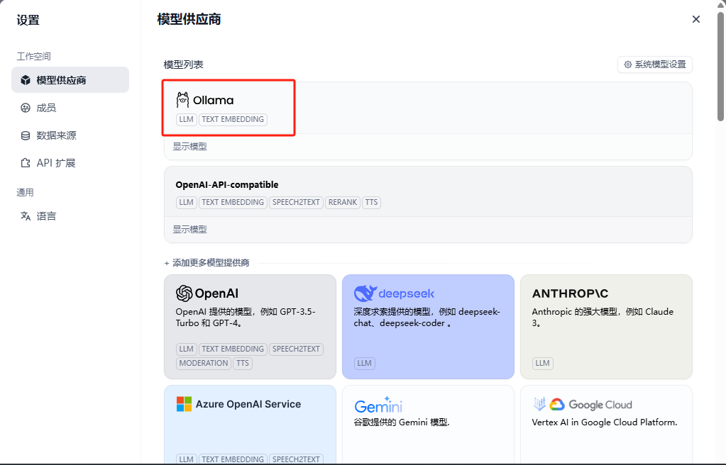 登录之后,在右上角设置的模型供应商处找到Ollama并安装