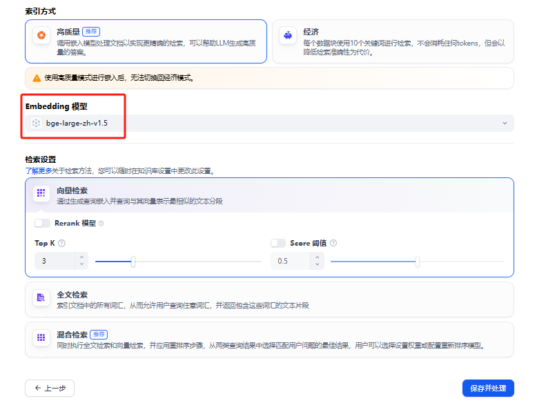 索引方式推荐使用高质量,但需要额外部署一个向量化embedding模型,embedding模型的核心作用是将文本转化为语义向量,构建可高效检索的索引体系。该模型通过深度学习将文档内容映射为稠密向量空间中的点,使语义相似的文本在向量空间中距离相近,从而支持基于语义相似度的快速检索(如FAQ匹配或文档推荐),同时保留上下文关联性以提升复杂查询的准确率。