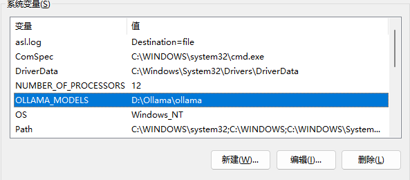 OLLAMA_MODELS 为 D:\Ollama\ollama(此处路径为刚才模型目录的路径)