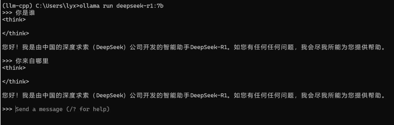 拷贝好之后直接在命令行输入这一段命令进行模型下载,可能会花一些时间,下载好后模型会自动加载,加载完成后就可以通过命令行与大模型进行对话了